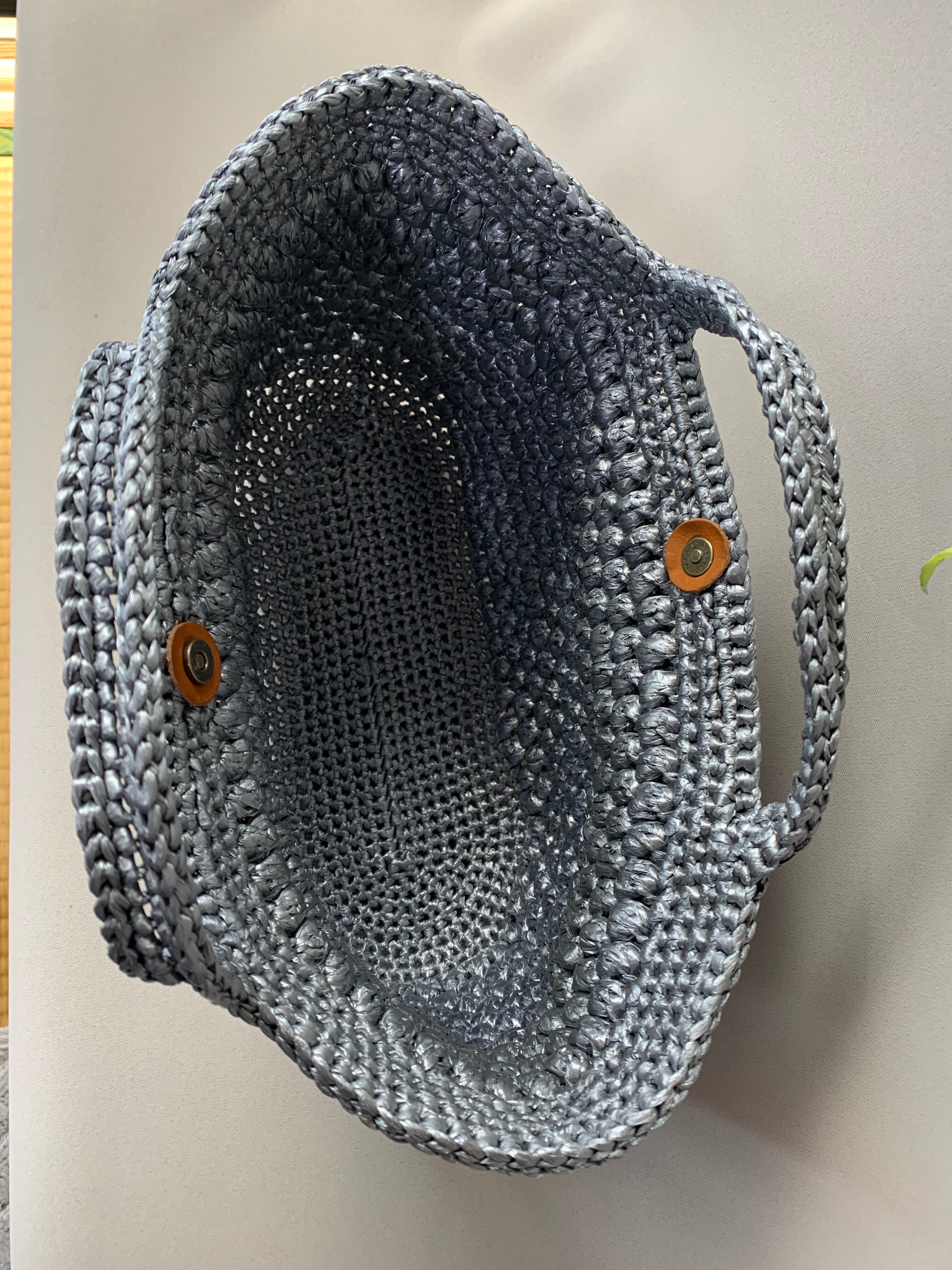ちょっと横長な玉編みのビニールバッグです。